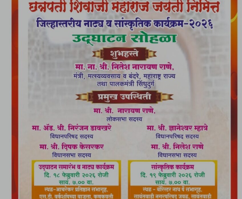 पालकमंत्री नितेश राणे यांच्या हस्ते उद्घाटन,१८ व १९ फेब्रुवारी रोजी आयोजनसर्वांसाठी विनामूल्य प्रवेश सिंधुदुर्गनगरी प्रतिनिधीछत्रपती शिवाजी महाराज यांच्या जयंतीनिमित्त सिंधुदुर्ग जिल्हा प्रशासनाच्या वतीने जिल्हास्तरीय भव्य नाट्य व सांस्कृतिक कार्यक्रमांचे आयोजन करण्यात आले आहे. महाराजांच्या शौर्य, पराक्रम आणि अद्वितीय कार्यकर्तृत्वावर आधारित हा दोन दिवसीय सोहळा १८ व १९ फेब्रुवारी २०२६ रोजी कणकवली व सावंतवाडी येथे रंगणार…