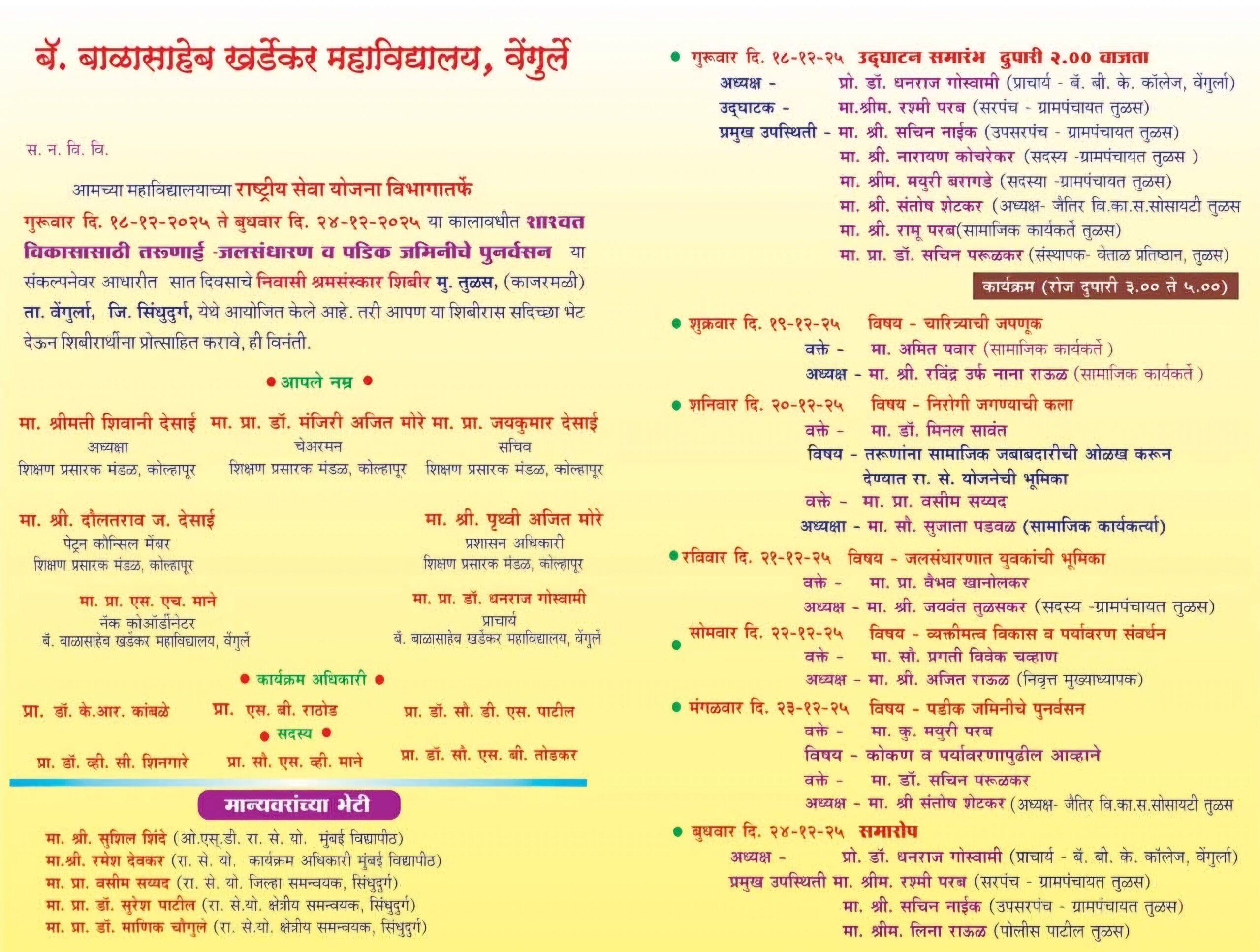 बॅरिस्टर बाळासाहेब खर्डेकर महाविद्यालयाच्या राष्ट्रीय सेवा योजना (एन.एस.एस.) विभागांतर्गत सात दिवसीय निवासी श्रमसंस्कार शिबिराचे आयोजन तुळस–काजरमळी येथे दि. १८ ते २४ डिसेंबर २०२५ या कालावधीत करण्यात आले आहे.