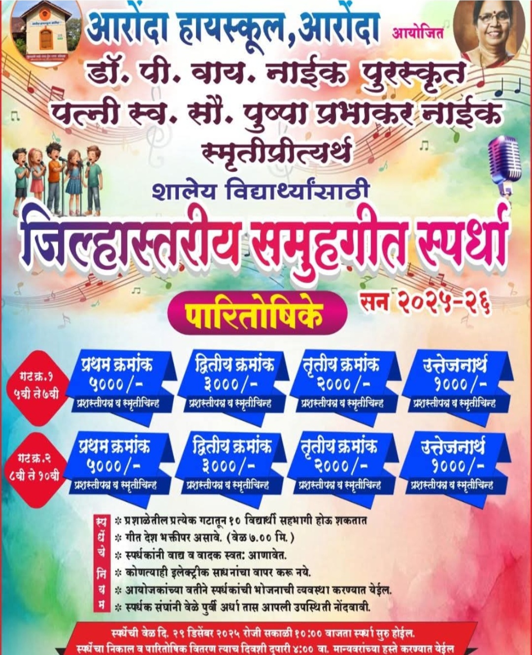 आरोंदा पंचक्रोशी शिक्षण प्रसारक मंडळ संचालित आरोंदा हायस्कूल, आरोंदा यांच्या वतीने शैक्षणिक वर्ष २०२५-२६ निमित्त भव्य जिल्हास्तरीय समूहगीत आणि चित्रकला स्पर्धांचे आयोजन करण्यात आले आहे. डॉ. पी. वाय. नाईक पुरस्कृत आणि त्यांच्या पत्नी स्व. सौ. पुष्पा प्रभाकर नाईक यांच्या स्मृतीप्रित्यर्थ या स्पर्धांचे आयोजन करण्यात आले असून, पंचक्रोशीतील विद्यार्थ्यांच्या कलागुणांना हक्काचे व्यासपीठ उपलब्ध करून देणे हा यामागील मुख्य उद्देश आहे.