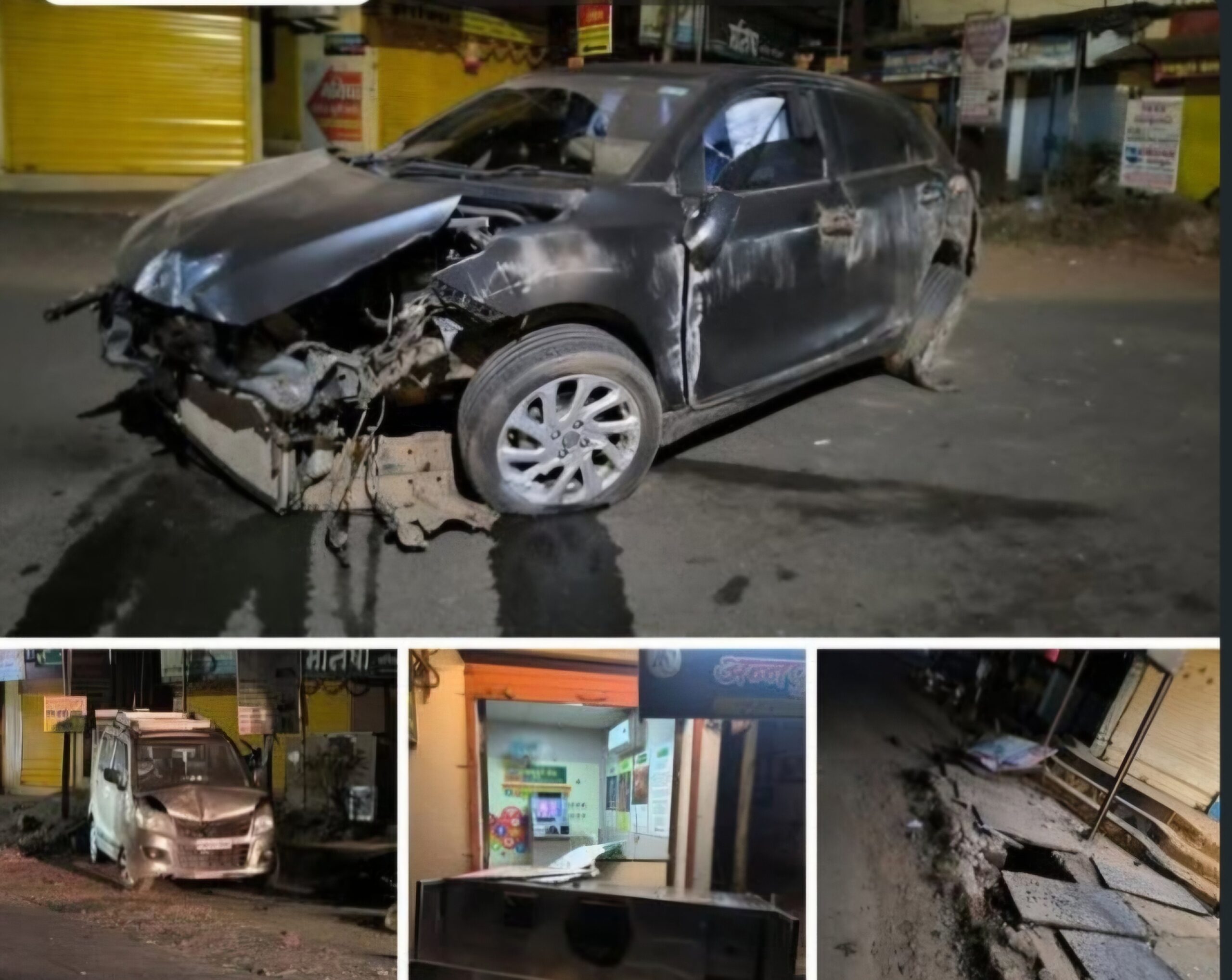कुडाळ शहरात मध्यरात्री घडलेल्या एका थरारक घटनेने संपूर्ण परिसर हादरून गेला. लुटीचा प्रयत्न करून पलायन करणाऱ्या भरधाव बलेनो कारचा गीता हॉटेलसमोरील मुख्य रस्त्यावर भीषण अपघात झाला. अनियंत्रित झालेल्या कारने रस्त्यालगतच्या दुकानांना जोरदार धडक देत रस्त्यावर उभ्या असलेल्या एका कारलाही ठोकर दिली. या अपघातात बलेनो कारसह उभी वॅनगार कार आणि एका दुकानाचे मोठ्या प्रमाणात नुकसान झाले आहे.