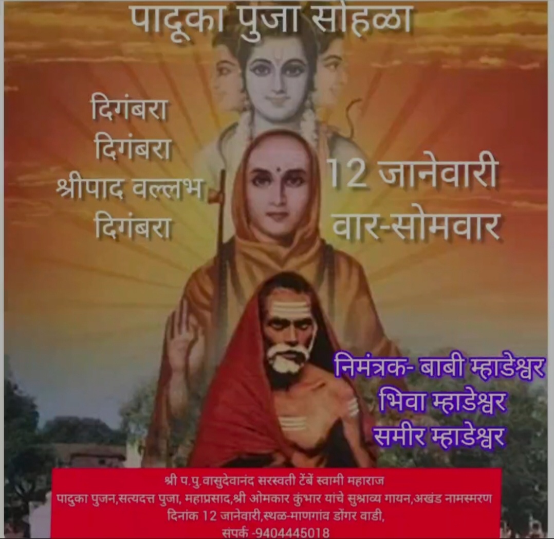 तालुक्यातील माणगांव डोंगरवाडी येथे दिनांक १२ जानेवारी रोजी प.पु. श्री वासुदेवानंद सरस्वती टेंबे स्वामी महाराज यांच्या पादुकांचे विधीवत पूजन, सत्यदत्त पूजा, महाप्रसाद, तसेच अखंड नामस्मरण अशा भक्तिमय कार्यक्रमांचे आयोजन करण्यात आले आहे.