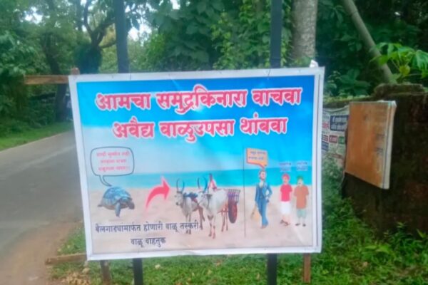 आमचा समुद्रकिनारा वाचवा,अवैध वाळू उपसा थांबवा;अशा आशयाचे बॅनर