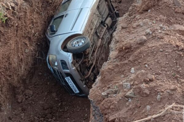 फोंडाघाट रस्ता रुंदीकरणातील खड्ड्यात कार कोसळून अपघात