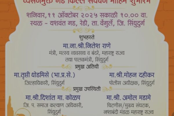 पालकमंत्री नाम. नितेश राणे यांच्या हस्ते शुभारंभ सिंधुदुर्ग प्रतिनिधीजिल्ह्याचे पालकमंत्री नितेश राणे यांच्या हस्ते ‘व्यसनमुक्त गड- किल्ले संवर्धन मोहिमेचा’ सिंधुदुर्गातून शुभारंभ होणार असून दिनांक ११ ऑक्टोबरला रेडी येथील यशवंतगडावर पालकमंत्री नितेश राणे आणि जिल्हाधिकारी तृप्ती धोडमिसे तसेच पोलीस अधीक्षक डॉ. मोहन दहिकर यांच्या उपस्थितीत या अभिनव उपक्रमाची सुरुवात करण्यात येणार आहे. सिंधुदुर्ग जिल्ह्यातील ऐतिहासिक गड-किल्ल्यांचे…
