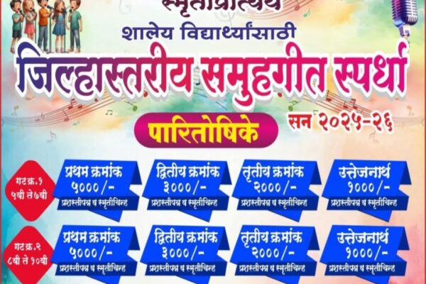 २५ डिसेंबरपर्यंत नाव नोंदणीचे आवाहन; विजेत्यांना मिळणार भरघोस बक्षिसे…. सावंतवाडीआरोंदा पंचक्रोशी शिक्षण प्रसारक मंडळ संचालित आरोंदा हायस्कूल, आरोंदा यांच्या वतीने शैक्षणिक वर्ष २०२५-२६ निमित्त भव्य जिल्हास्तरीय समूहगीत आणि चित्रकला स्पर्धांचे आयोजन करण्यात आले आहे. डॉ. पी. वाय. नाईक पुरस्कृत आणि त्यांच्या पत्नी स्व. सौ. पुष्पा प्रभाकर नाईक यांच्या स्मृतीप्रित्यर्थ या स्पर्धांचे आयोजन करण्यात आले असून,…
