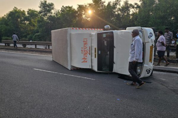 मुंबई – गोवा महामार्गावर पिटढवळ फुलावर मासे वाहतूक करणारी बोलेरो पिकअप गाडीला अपघात होऊन पलटी.