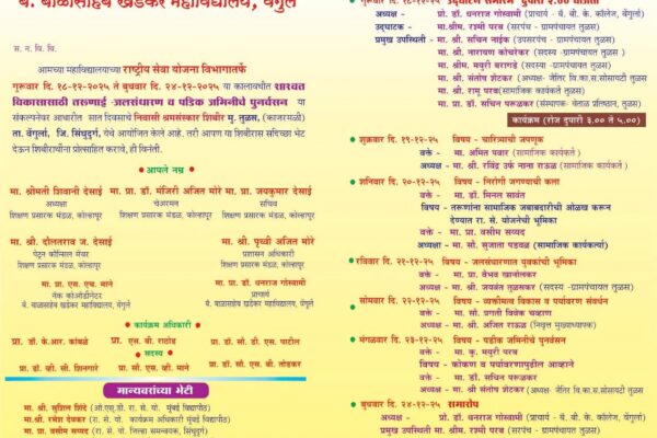 वेंगुर्लाबॅरिस्टर बाळासाहेब खर्डेकर महाविद्यालयाच्या राष्ट्रीय सेवा योजना (एन.एस.एस.) विभागांतर्गत सात दिवसीय निवासी श्रमसंस्कार शिबिराचे आयोजन तुळस–काजरमळी येथे दि. १८ ते २४ डिसेंबर २०२५ या कालावधीत करण्यात आले आहे.या शिबिराचा मुख्य उद्देश शाश्वत विकासासाठी तरुणाईचा सक्रिय सहभाग वाढविणे हा असून, त्याअंतर्गत जलसंधारण व पडीक जमिनीचे पुनर्वसन,आरोग्य दक्षता, ग्रामस्वच्छता तसेच पर्यावरण संवर्धन यांसारख्या महत्त्वाच्या विषयांवर विविध उपक्रम…
