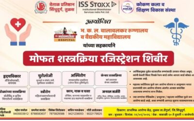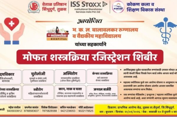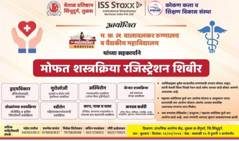 वेंगुर्लाग्रामीण व दुर्गम भागातील आर्थिकदृष्ट्या दुर्बल घटकांतील रुग्णांना दर्जेदार व तज्ज्ञ वैद्यकीय सेवा सहज उपलब्ध व्हाव्यात,या सामाजिक उद्देशातून वेताळ प्रतिष्ठान,सिंधुदुर्ग – तुळस आणि कोकण कला व शिक्षण विकास संस्था यांच्या संयुक्त विद्यमाने तसेच भ.क.ल.वालावलकर रुग्णालय व वैद्यकीय महाविद्यालय यांच्या सहकार्याने मोफत शस्त्रक्रिया रजिस्ट्रेशन शिबिराचे आयोजन करण्यात आले आहे.हे शिबिर बुधवार,दि २१ जानेवारी २०२६ रोजी सकाळी…